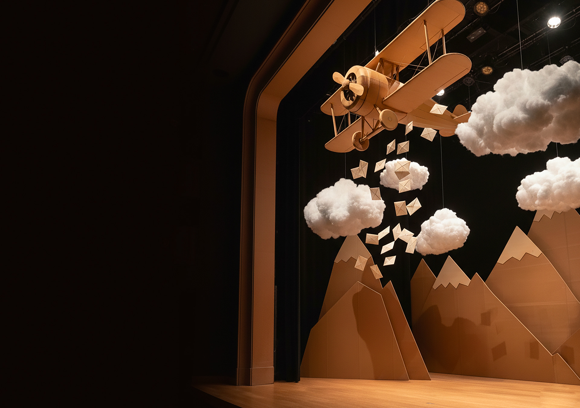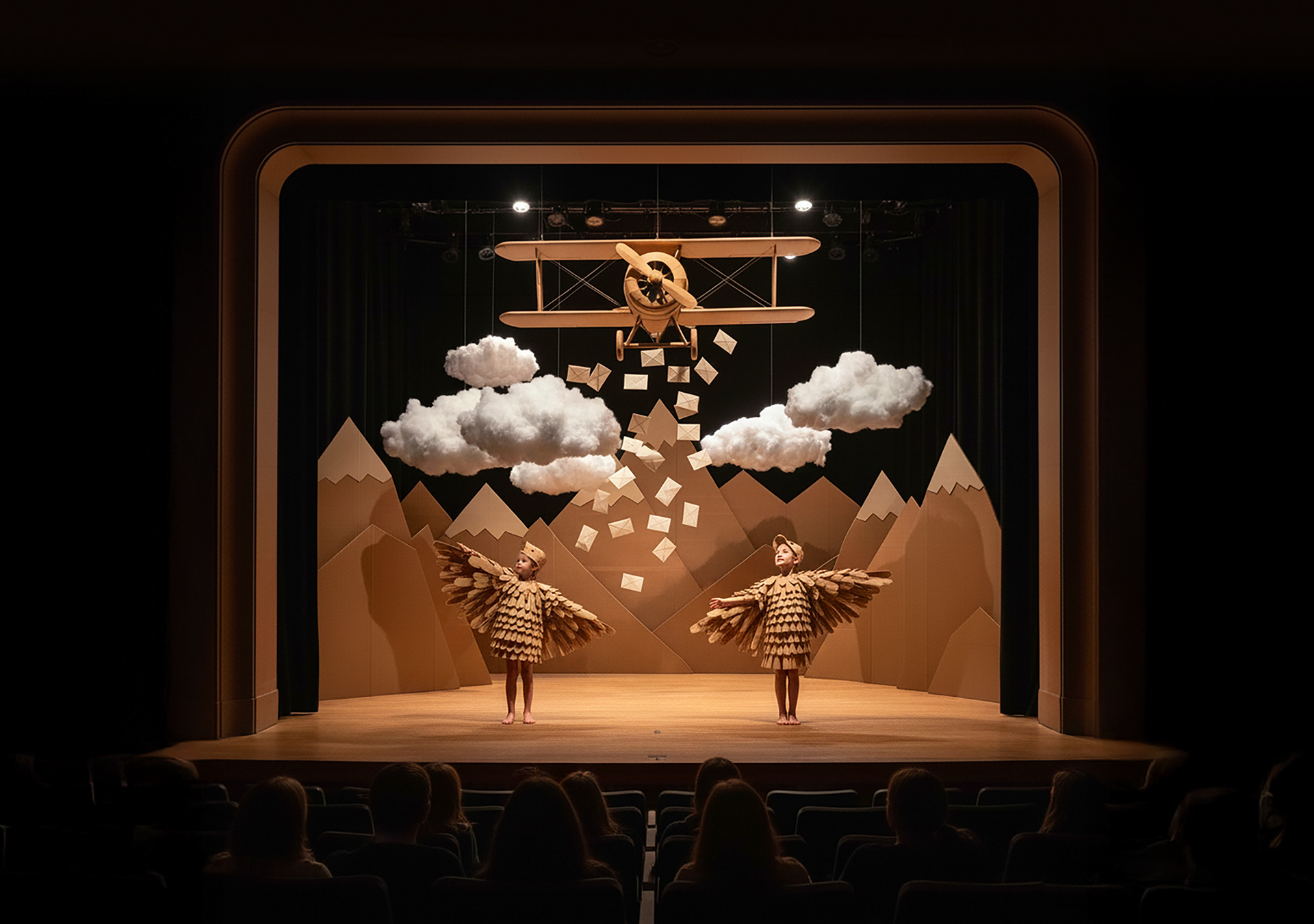 This set and costume design embraces formal simplicity and emotional impact. Every element was crafted to feel as if made by children — playful, imperfect, and full of wonder. The result is a world that looks handmade by magic, inviting the audience into a space of pure imagination.